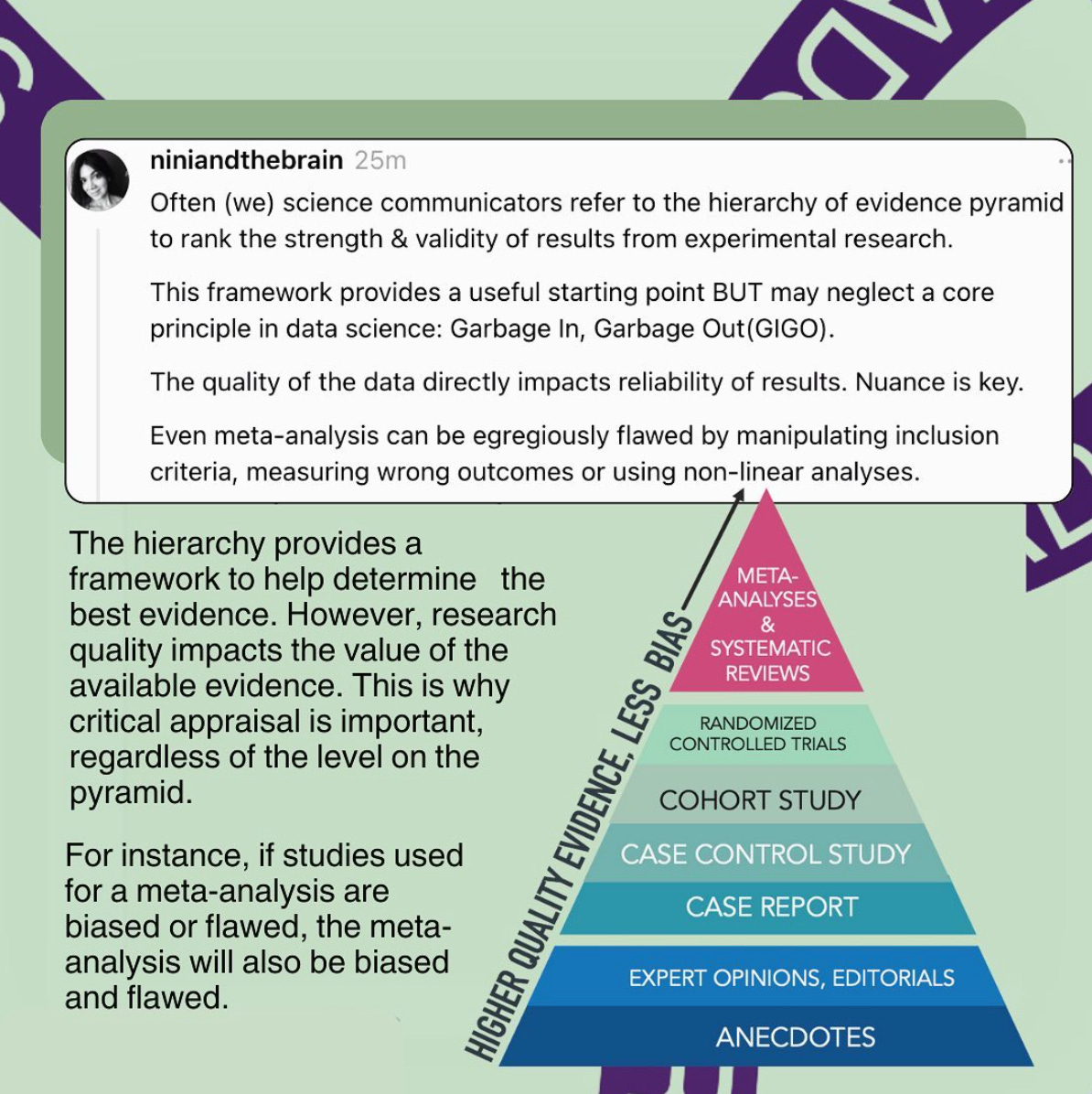 More than whether a study exists, one needs to first look at the strength and structure of the evidence behind it. I have referred to the hierarchy of evidence pyramid to rank the strength and validity of results. While this framework provides a useful starting point, it is key to note that the quality of the data impacts the reliability and validity of the results.